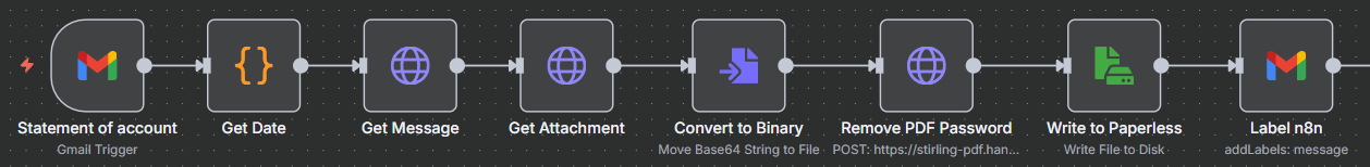 remove-passwordREST API with the binary file to unlock the PDF. - Label and tag (date along with other metadata such as bank name and account number) the unlocked PDF and upload it to Paperless-ngx for archival and processing.