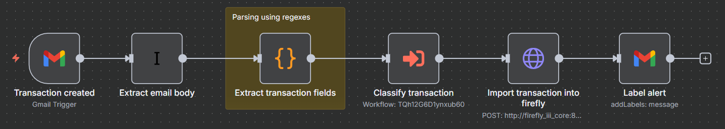 - Parse the email body using regular expressions to retrieve the transaction details.